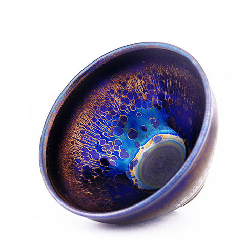 Jian Zhan (Tian Mu Porcelain), as a representative of black porcelain, is one of the eight famous porcelains of the Song Dynasty in China. Jian Zhan was created in Tang Dynasty and the beginning of the Five Dynasties, the middle period of the Northern Song Dynasty to the middle of the Southern Song Dynasty was the heyday of Jian kilns. The outstanding achievements of Jian Zhan craft are reflected in the unpredictable and colorful glaze color, the representative glaze color is Wujin glaze, rabbit hair glaze, oil drop glaze, partridge feather glaze, yao bian etc. The shape of Jian Zhan is mainly bowl, which is simple and classic. The whole cup is heavy and hard, with grey black inner body; the glaze is thick and densely bonded with the inner body.